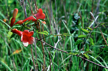 Interesting info Vivid red trumpet creeper brightens the roads of Posey County and nearby Illinois. Where it grows, it grows profusely. |