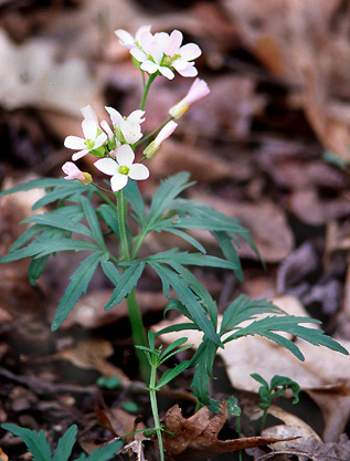 Interesting info One of the first plants to bloom in the spring. Found in the preserve in April but often seen earlier in warmer soil elsewhere in southern Indiana. The deeply cut leaves distinguish this plant from the similar spring cress and from Houstonia, which blooms later in the year. The flowers are generally white, but sometimes pink
