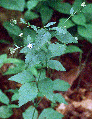 Interesting info Small white flowers are easy to overlook. The three-part, serrated leaves are characteristic of the rose family. Fruit has large hooked bristles. |