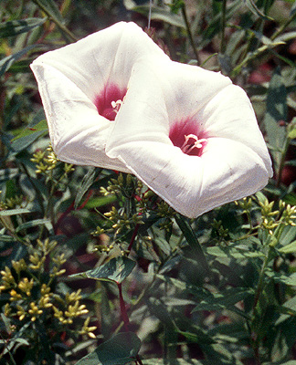 Interesting info Showy white flower with maroon or purple center. The large, edible tuber (or root) has been known to grow to six feet in length. Also known as man-of-the-earth (because of its monstrous root?).