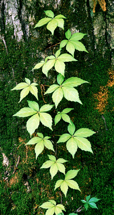 Interesting info This attractive plant mingles with poison ivy on the forest floor and often climbs the same trees. The leaves turn a beautiful scarlet in the fall. Some folks call this plant "poison oak" and steer clear of it, but the leaves are not toxic to the touch. Poison oak (Toxicodendron toxicarium) is not found in Indiana. Also known as five-finger-ivy. |