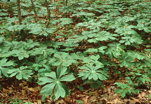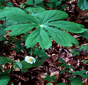 Interesting info Big, umbrella-shaped leaves of mayapple sometimes carpet the forest floor. The large white flowers hide under the leaves. Look for them at the crotch of the double-leafed plants. Produces yellow fruit in May. |