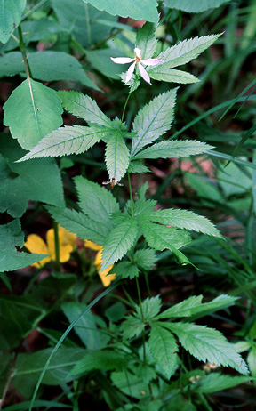 Interesting info The five long petals of Indian physic are distinctive. Judging by the common names, someone evidently used this plant for medicinal purposes. Leaf structure is similar to cinquefoil. The yellow flower in this picture is some sort of evening