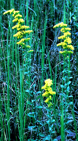Interesting info Gray-green stem and rounded leaves are distinctive in this goldenrod. Flowers tend to cluster near the stem, and do not form large sprays as they do in tall goldenrod. |