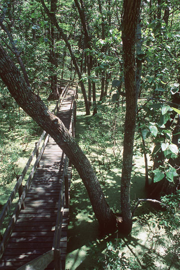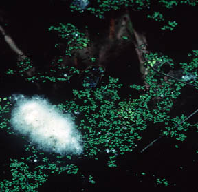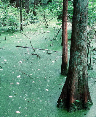 ![]() The seed of the cottonwood trees floats through the air on fluffy white puffs of "cotton." The buttressed tree in the foreground at left is actually a bald cypress |