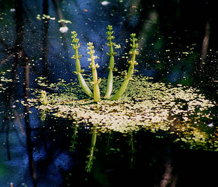 Prothonotary warblers and many other birds are often seen from the boardwalk. This one (possibly a juvenile?) has an odd black mark on his brow. At left is featherfoil (Hottonia inflata), an aquatic plant that is endangered in Indiana. Featherfoil can be seen from the boardwalk, but while it is abundant in some years it may be nonexistent in others. |