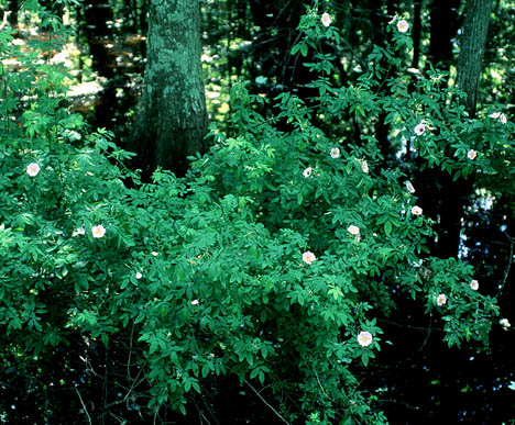 Toward the end of June, watch for the swamp roses (Rosa palustris) to bloom on a bush along the boardwalk. |